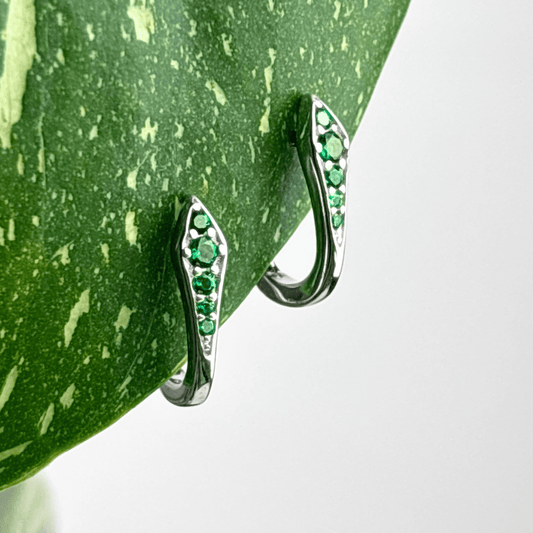 Green Mini Snake Zirconia Silver Huggie Earrings
